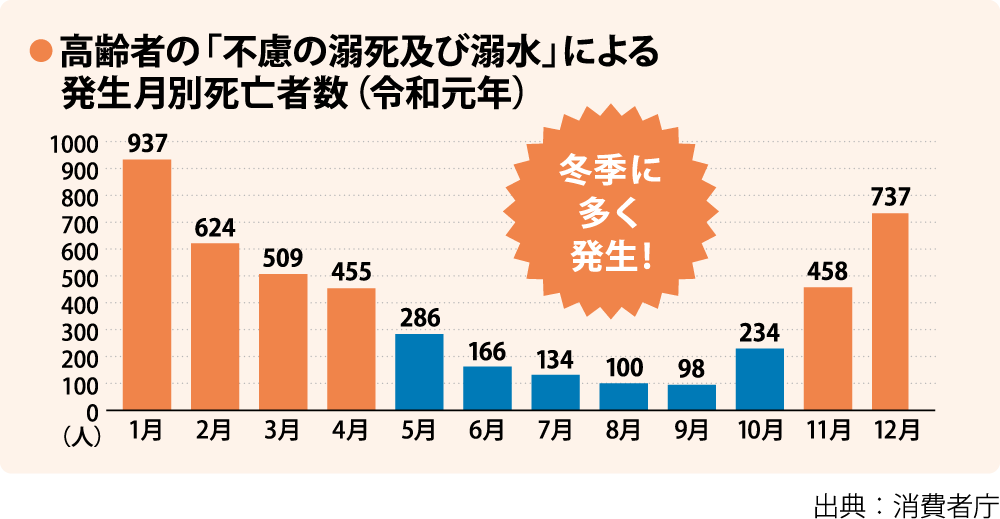 入浴中に亡くなる不慮の事故は、特に冬季(12月~2月)に、年間発生件数の約半数が集中します。これは、暖かい部屋から寒い脱衣所への移動によって血圧が急変する、いわゆる「ヒートショック」が主な引き金となっていることを示しています。
