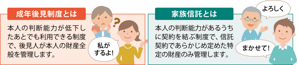 こうした事態に備え、事前に身の回りの環境を整えておきましょう。普段使うお金と将来の資金を分けて口座やカードの管理を簡単にし、通帳や保険証券などの重要書類は家族で保管場所を共有しておきましょう。また、財産管理や契約行為を本人に代わって家族や専門家が行う「成年後見制度」や、自分の財産をあらかじめ定めた信託契約によって家族に託す「家族信託」を活用する方法もあります。