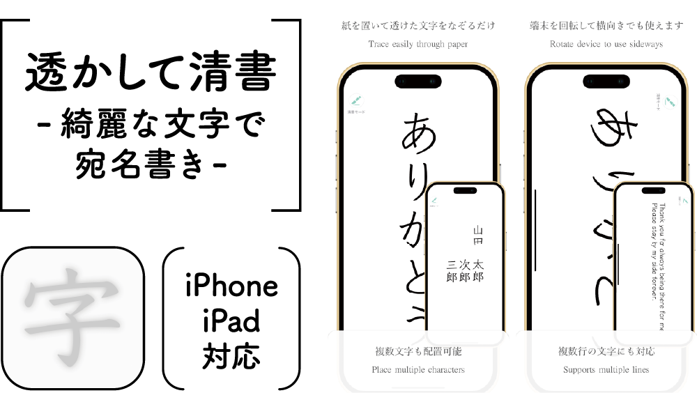 スマホの上に紙を置いてなぞるだけで文字の練習ができる便利なアプリ。横書きはもちろん、縦書きにも対応しているので、用途に合わせて練習ができます!