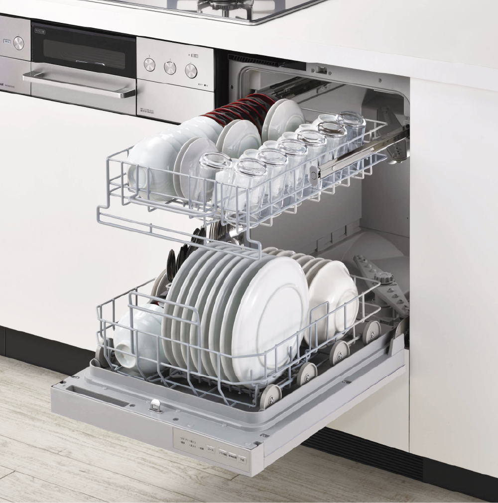 手洗いの場合、洗う・洗い流す・拭き上げるまでの時間が必要ですが、食洗機は食器を庫内に入れてスイッチを押すだけでOK。手に水が触れる時間が短くて済む上、一定の水量を効率的に使用しているため手洗いに比べて節水になります。
